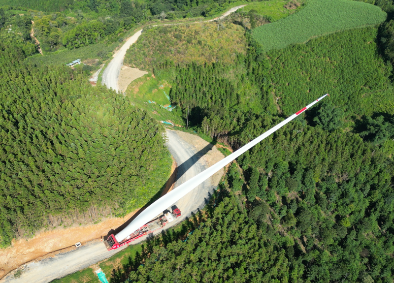 前方,一輛輛裝載著超長風機葉片的大型運輸車緩緩向山脊攀升,頭戴安全帽、身穿反光背心的建設者們在路口默契指揮,前車開道、后車收尾,人與車的身影與蔥蘢山色相映成趣,奏響了深山運輸的協作之歌。